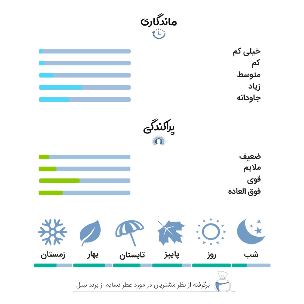 - پخش: از همان اسپری اول، رایحه با ظرافت و در عین حال قابل توجه در فضا پخش میشود و اطرافیان را بهخوبی جذب میکند. کافی است چند قطره روی لباس یا گردن بزنید تا رد بویی لطیف و ماندگار به جای بگذارید.